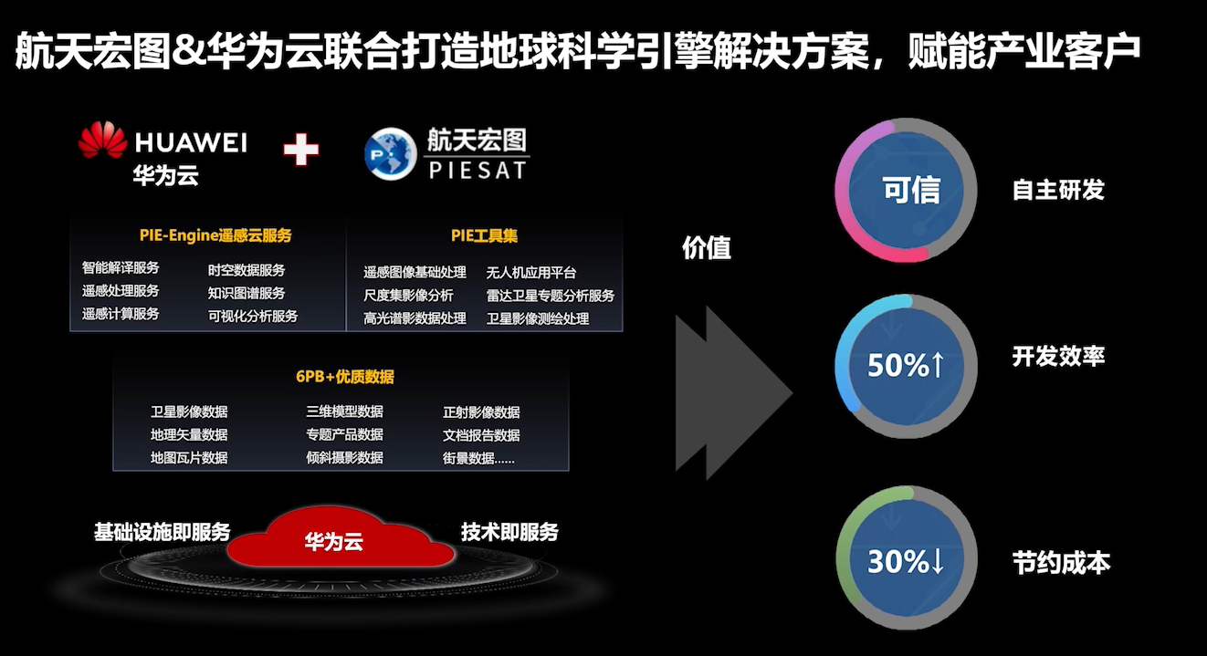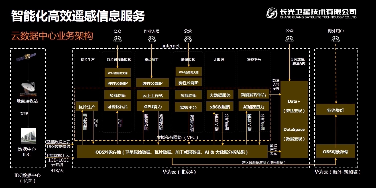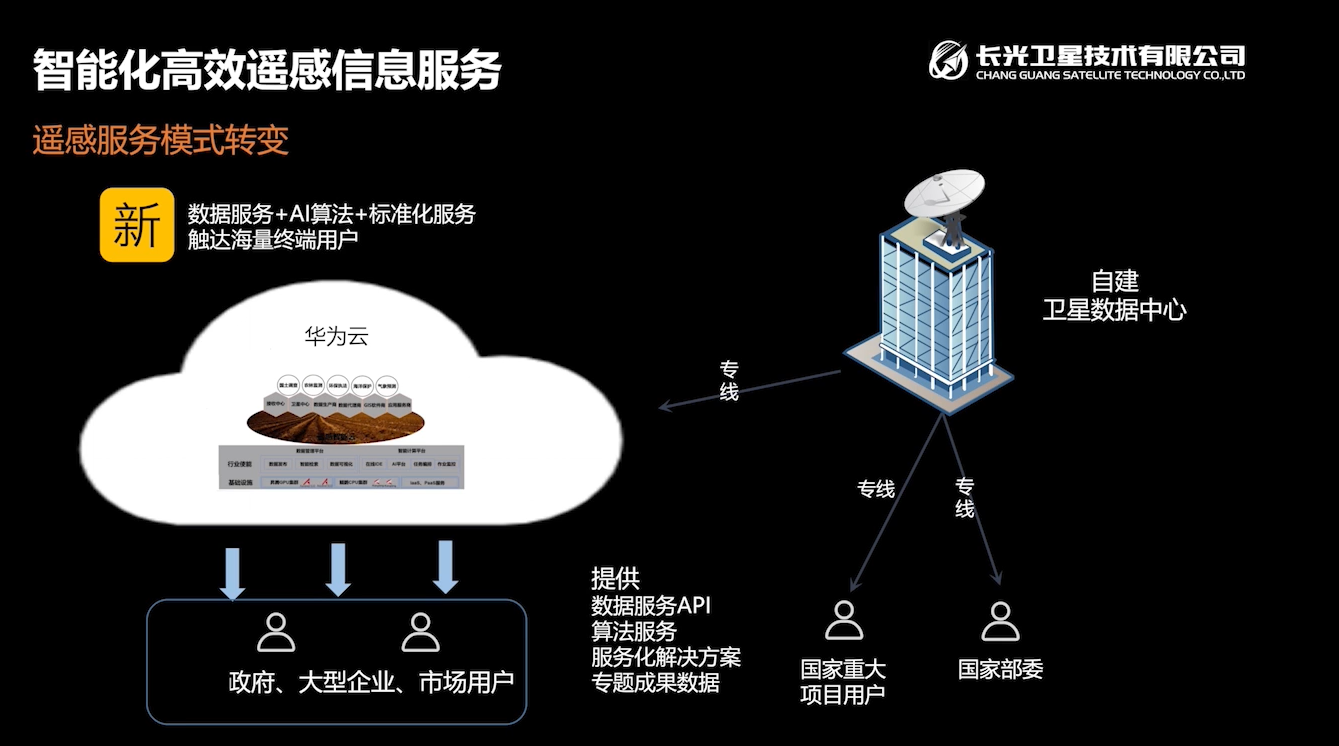 合作架构:由华为云提供专线与自建的卫星数据中心建立数据传输连接,依托华为云的算力、模型、引擎等支持,对采集的数据进行处理,最终服务于政府、大型企业或个人。