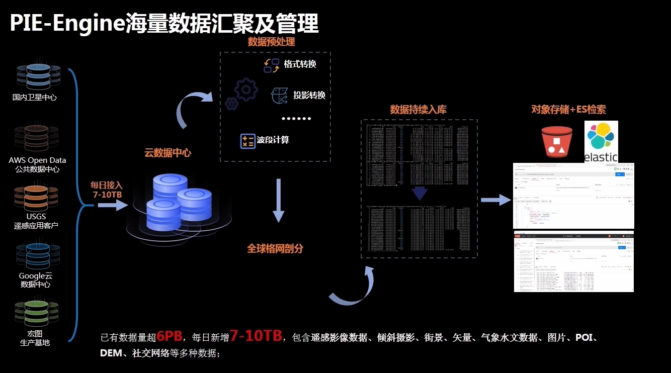 数据汇聚及管理:已有数据量差6PB,每日新增数据7-10TB,数据内容包含遥感数据、倾斜摄影数据、水文数据、图片、街景、矢量等。