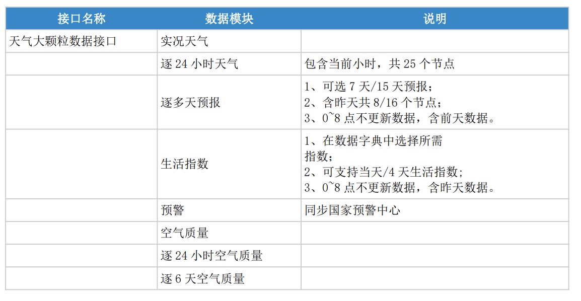 - 最美天气大颗粒接口,主要根据授权信息,按照经纬度/城市码/ip 地址, 一次性获取所需天气常规数据(实况、小时天气、多天预报、生活指 数、空气质量等)。