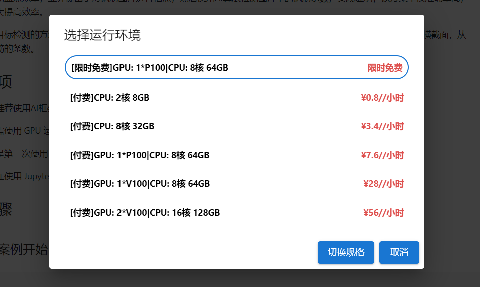 由于需要GPU下运行,所以我们需要进行规格切换,并选择 [限时免费]GPU: 1*V100|CPU: 8核 64GB ,点击切换规格。