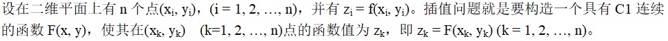 以上介绍的散乱数据插值方法适合于中小规模数据量,对于大规模散乱数据(如10000点以上)可一采用基于多层B样条的插值方法。这里采用的方法是局部化的与距离成反比的插值方法,即对于插值点(x, y),取与这个点最近的n点参与插值运算,这样就减少了参与插值运算的数据量,从而可以利用小规模散乱数据插值方法,加快了运算速度。散乱数据的插值问题一直引人关注,提出了很多算法。但是由于应用问题千差万别,数据量不同,对连续性的要求也不同,没有一种算法适合于所有的场合。特别是大规模散乱数据的插值问题还正在研究之中。