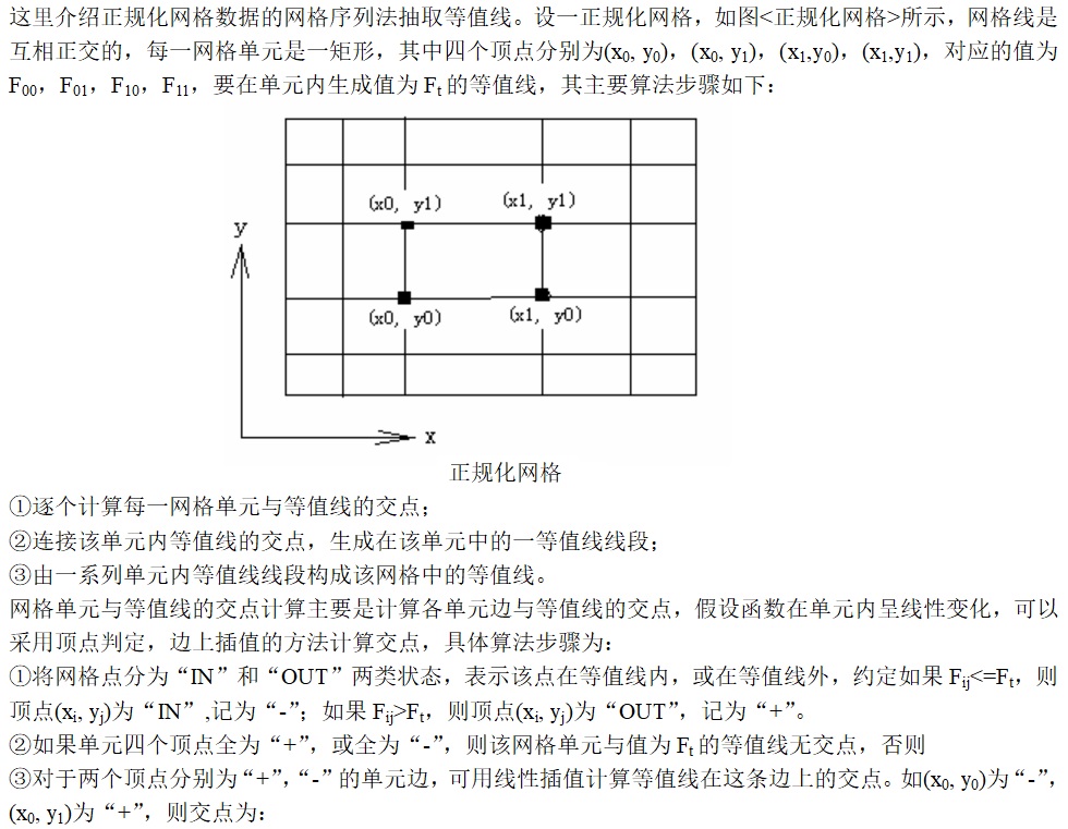 对于二维标量场,其数据往往是定义在某一网格面上的。根据网格类型的不同,其等值线抽取方法也各不相同。网格具体可分成两类:正规化网格(regular grid )和非正规化网格(irregular grid)。等值线的抽取方法具体可分为两类,即网格序列法和网格无关法。