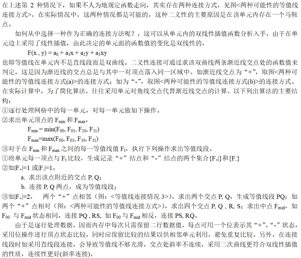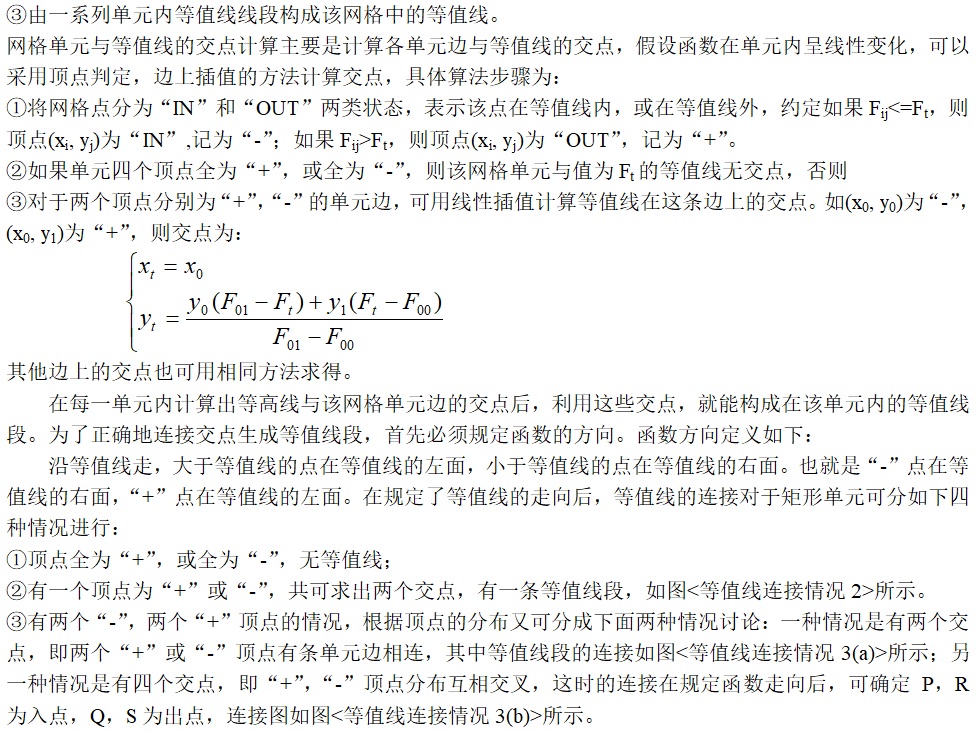 网格序列法(grid sequence)的基本思想是按单元的排列次序,逐个处理每一单元,寻找每一单元内相应的等值线段。在处理所有单元后,就自然生成了该网格中的等值线分布。对于某一值的等值线,其穿过的单元数往往只占整个网格单元数的较小部分(10%以下),因此这种处理所有单元网格的方法效率不高,特别是在大型密集网格分布的情况下,效率就更低了。网格无关法就是针对这种情况的高效的等值线生成方法。网格无关法通过给定等值线的起点,或先求出其起始点,利用该点附近的局部几何性质,计算该等值线的下一点,然后,利用已经求出的新点,重复计算下一点,直至到达区域边界,或回到原起点。网格无关法主要有三类:步进法、适应法和递归法。
