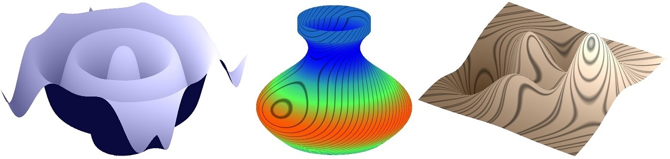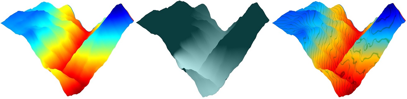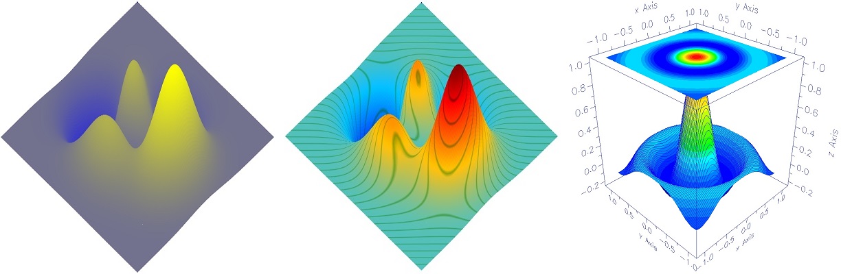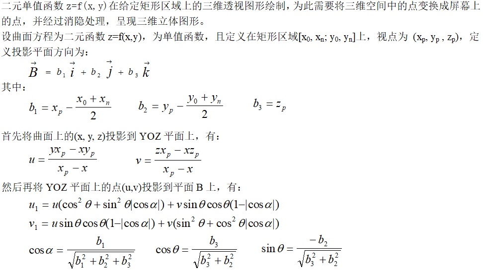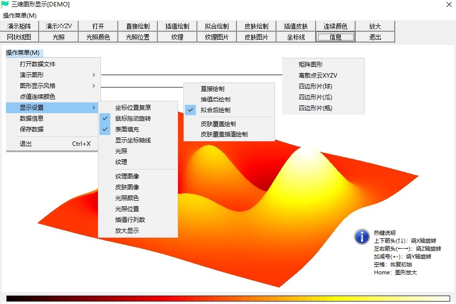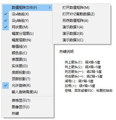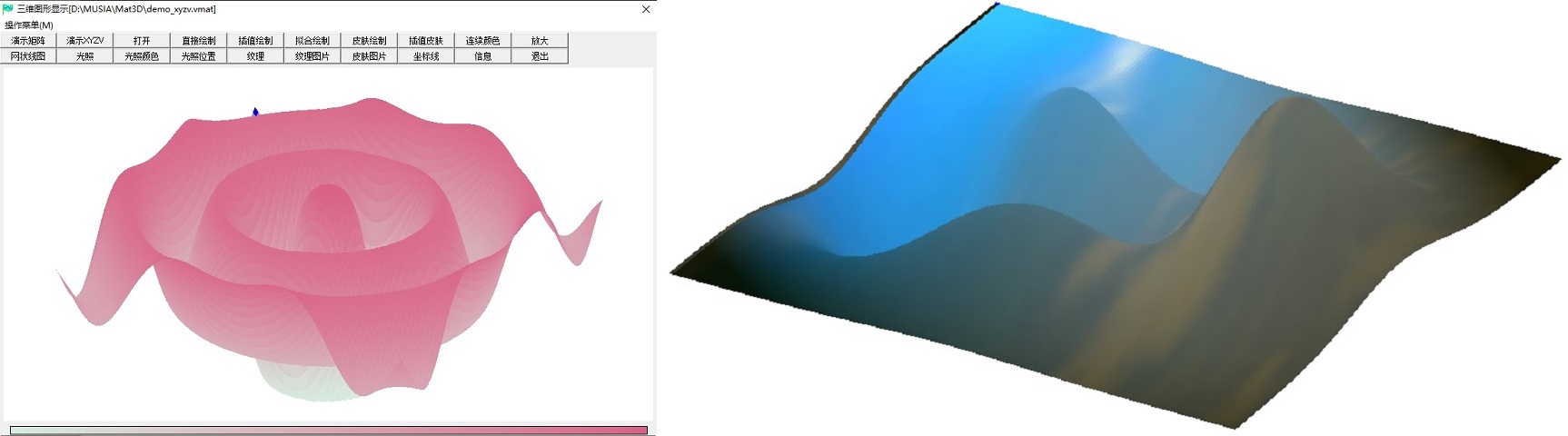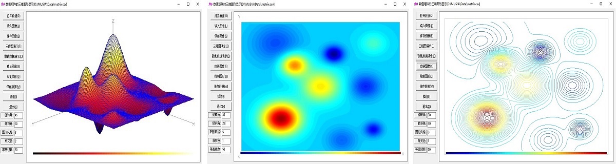 用图形显示二维数值矩阵(数值表格),十分直观,容易理解矩阵元素之间的关系,是一种数据的可视化表达方法。显示数值矩阵的方式包括图像、三维图形、等值线等。二维数值矩阵可以认为是二元函数z=F(x,y)的抽样结果。离散数据点集(xi,yi,zi)可以经过插值抽样后生成数值矩阵。三维表面图形的光照、纹理、皮肤增强了图形显示效果,并通过旋转来观察各个侧面。数值矩阵、离散数据点或者离散三角形和四边形平面数据可以保存在ASCII码文本格式文件中。