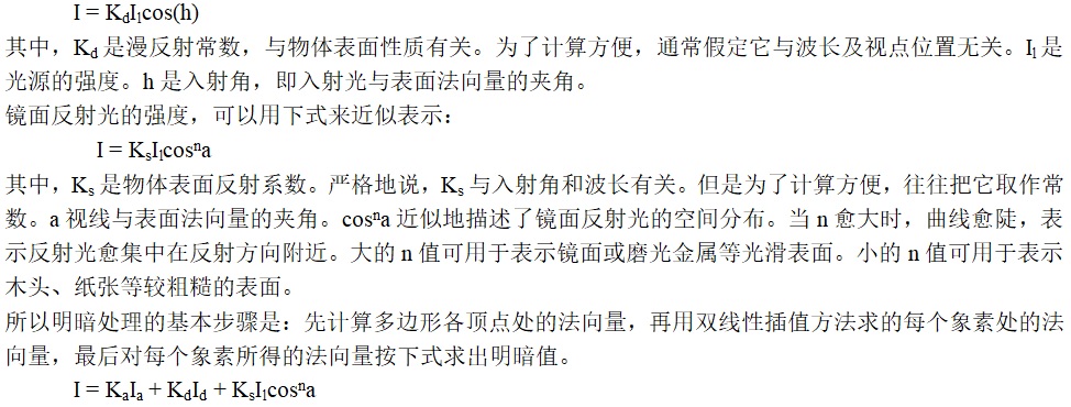 【明暗效应】所谓明暗效应,指的是对光照射到物体表面所产生的反射/透射现象的模拟。当光照射到物体表面时,可能被吸收、反射或透射。被物体吸收的那部分光转化为热,我们使用一些数学公式来近似计算物体表面按什么样的规律,什么样的比例来反射/透射光。这种公式称为明暗效应模型。三维体的图形在经过消隐后,再进行明暗效应处理,可进一步提高图形的真实感。