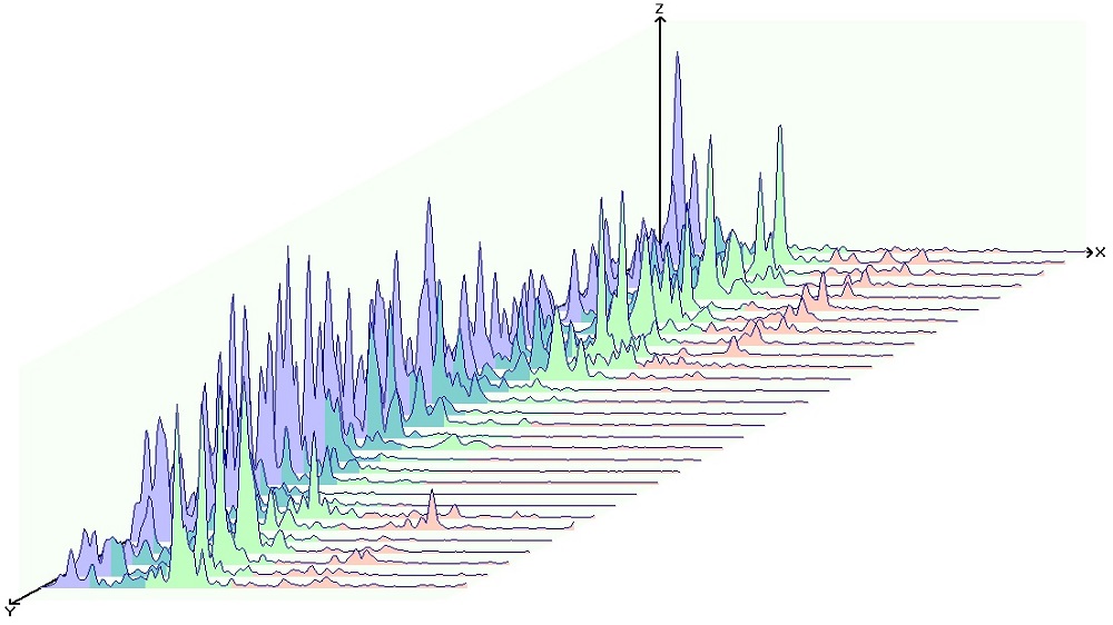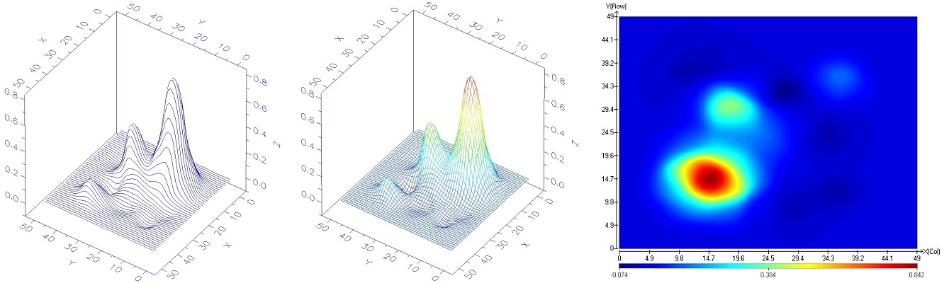 对于n行m列二维数值矩阵v(i, j),i = 0, 1, …, n-1,j = 0, 1, …, m-1,可以用三维图形或者二维图像来显示,在三维图形中x轴代表列,y轴代表行,z轴代表矩阵元素的数值大小,在图像显示中,x轴代表列,y轴代表行,图像的颜色代表矩阵元素的数值大小。如果矩阵的行列数太大或者太小,可以经过二维插值抽样后得到合适的矩阵尺寸,以满足绘图需要。