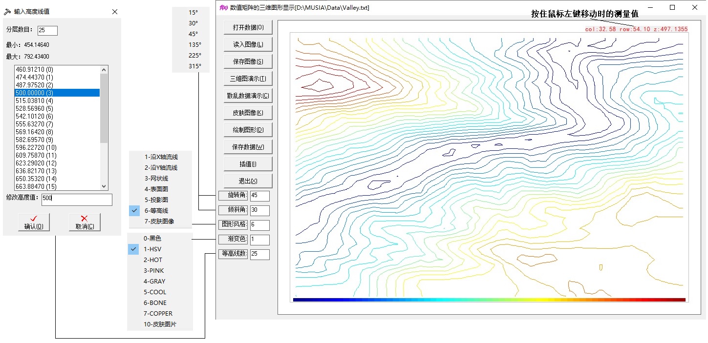 以等高线为例,可以设置等高线的线数以及每个高度的值,等高线显示风格为6,在图形中按下鼠标左键移动可以测量行号、列号以及高度值。