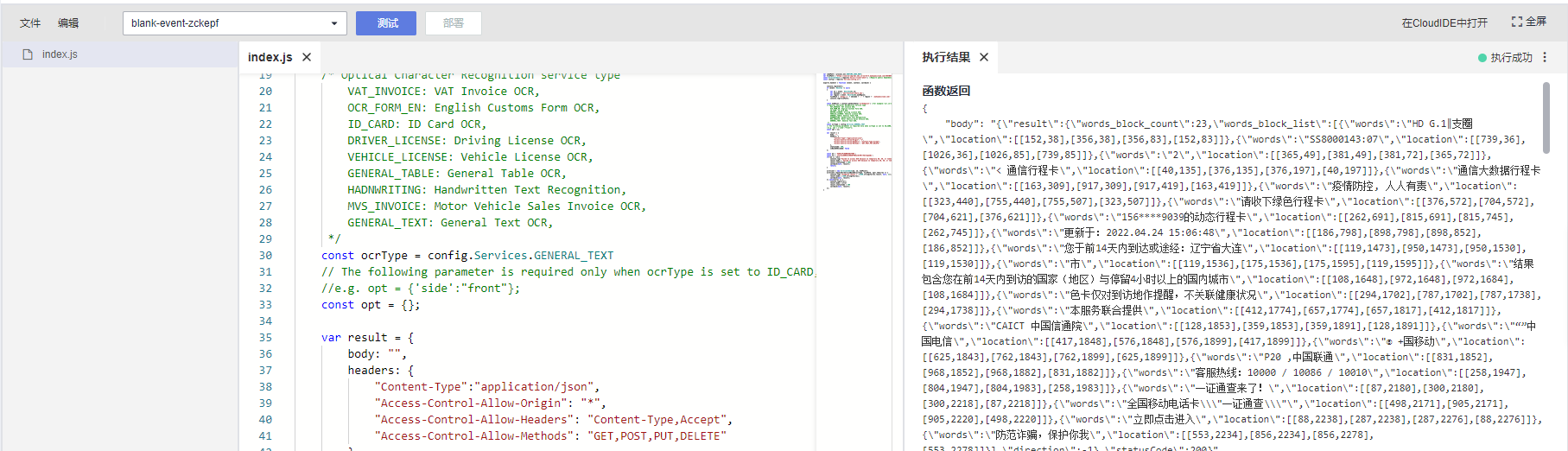 然后按活动指导,在函数工作流 FunctionGraph创建了一个函数,并复用了活动中使用的代码,只是把调用的ocr服务类型修改为通用文字识别。