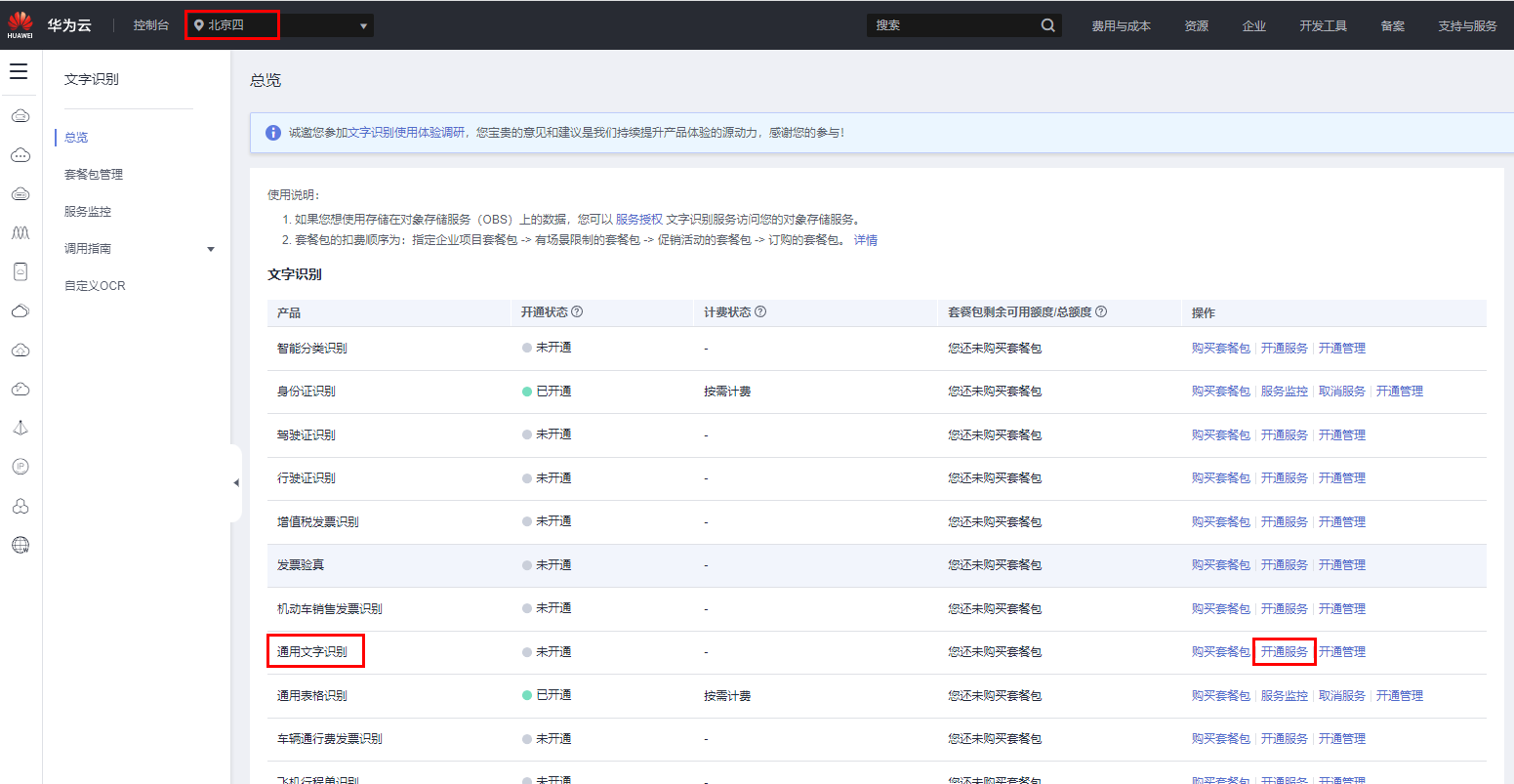 首先,健康码的主要内容都是文字,所以我先开通了华为云OCR的通用文字识别服务。