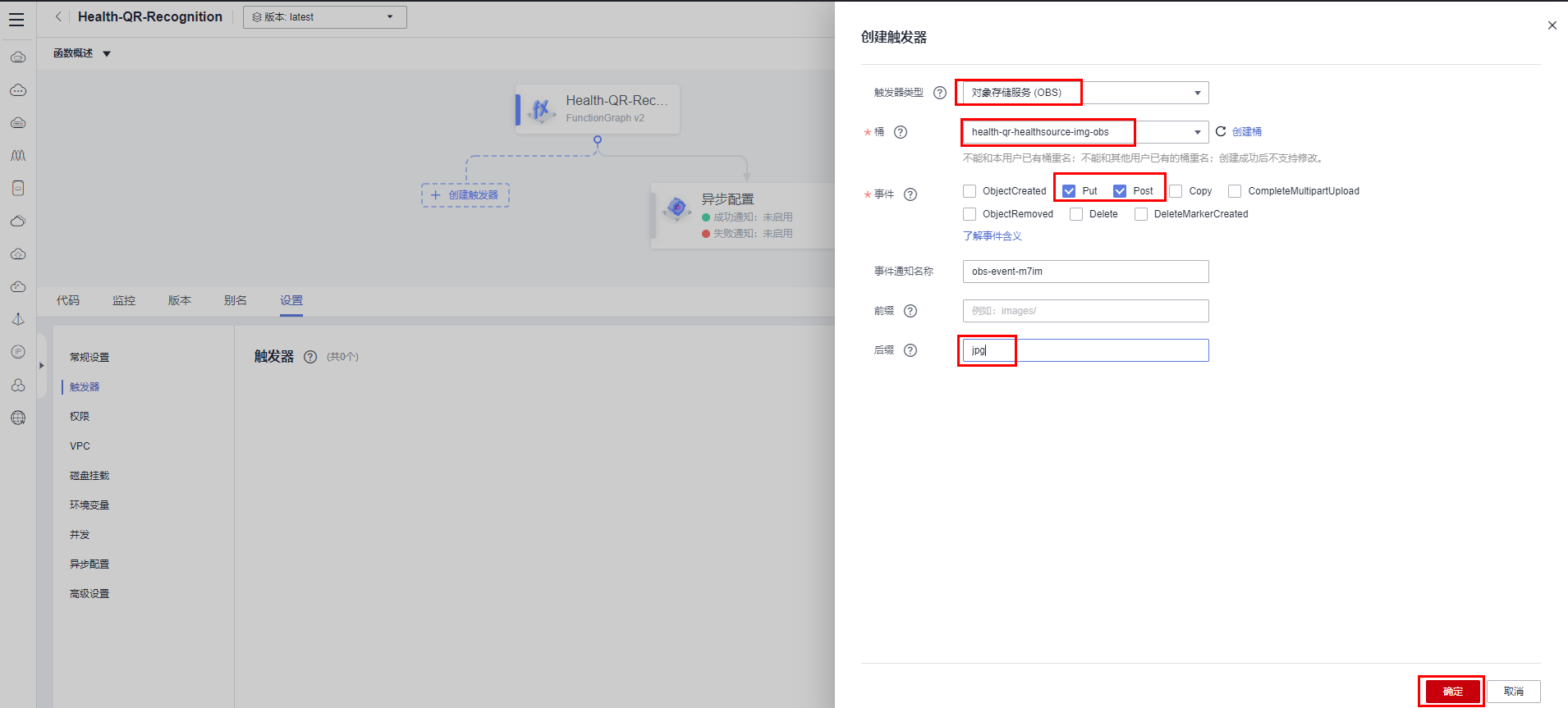 函数工作流 FunctionGraph支持创建触发器,所以我又给函数创建了一个OBS的触发器,这样只要有图片上传到这个OBS中,就会触发健康码识别函数执行。