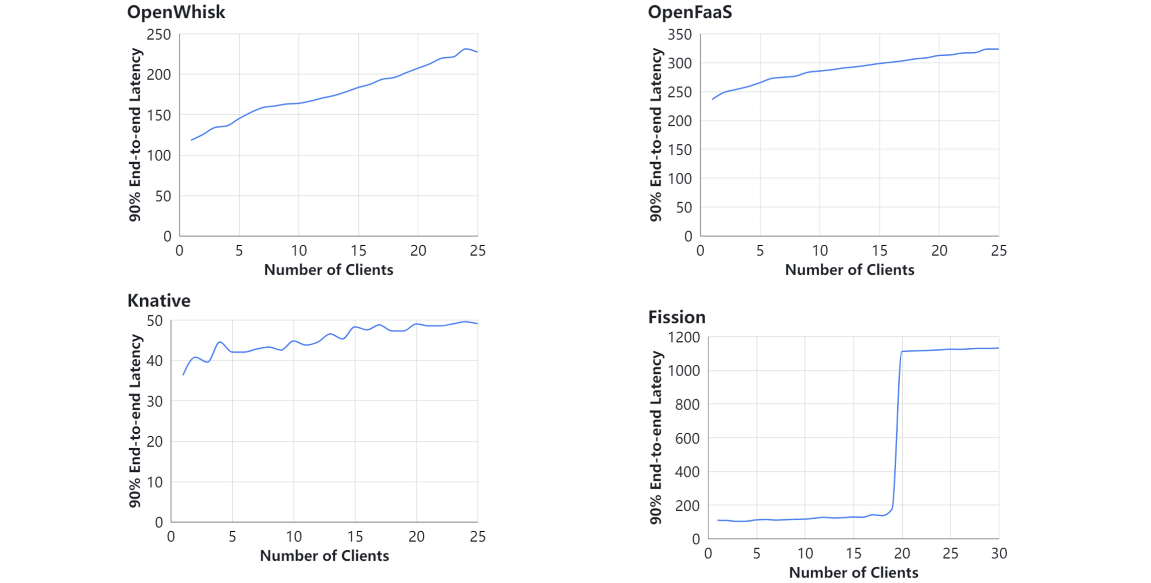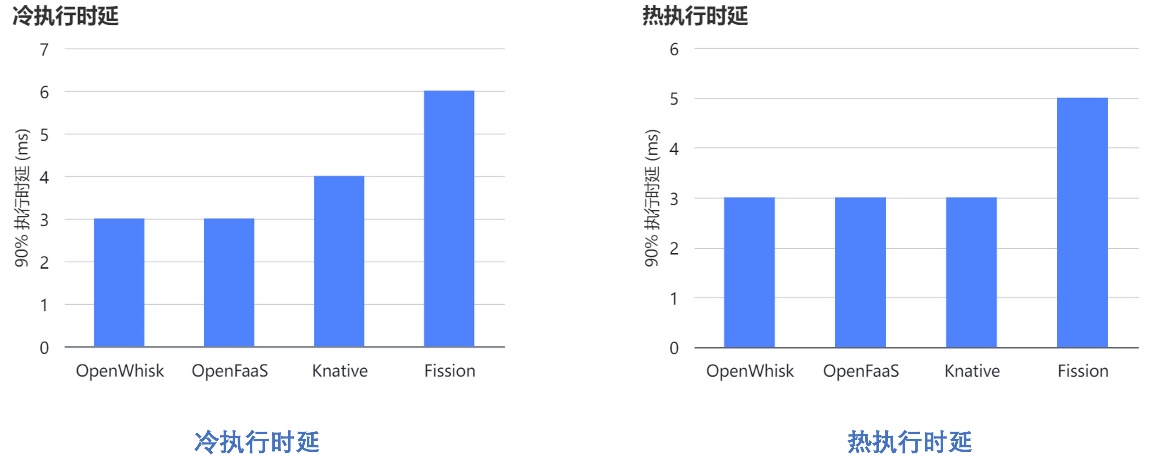 测试从调用 invoke 指令到函数的第一条指令的时间差。图4所展示的结果为 p90 的时延开销。可以看到,OpenFaaS在冷热启动性能上表现最差;得益于资源池预热技术,Fission在冷启动性能上表现最佳。