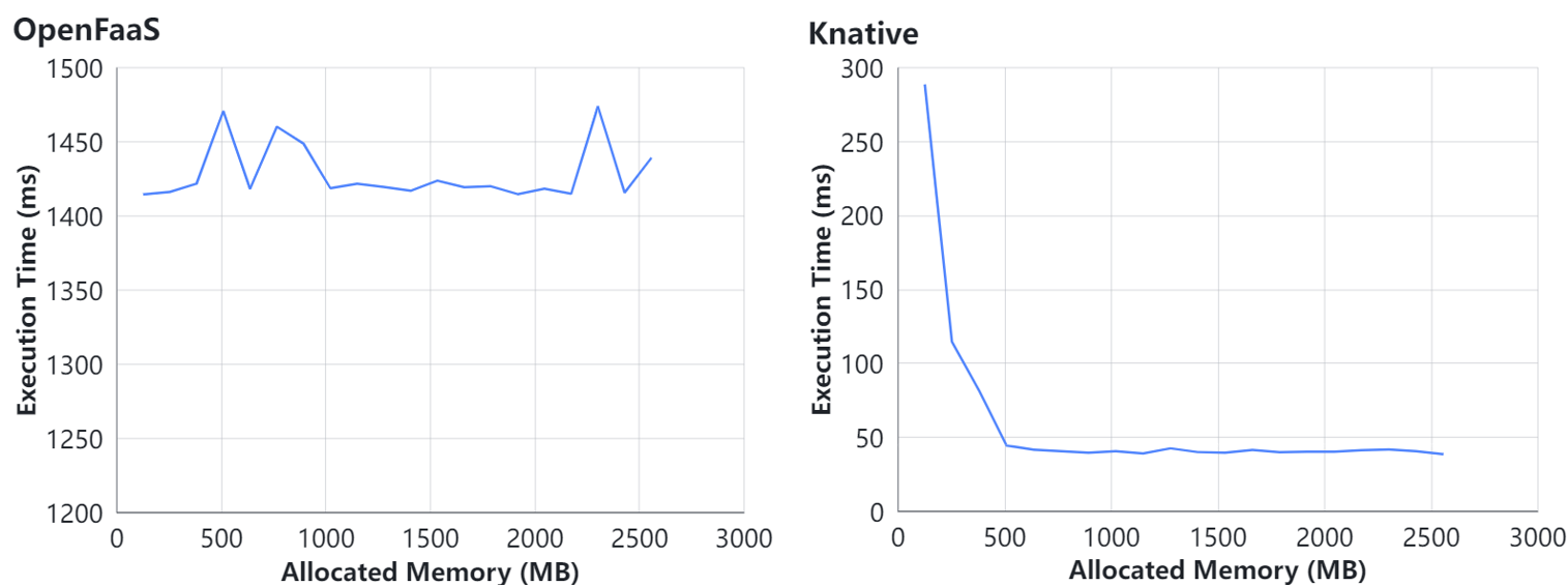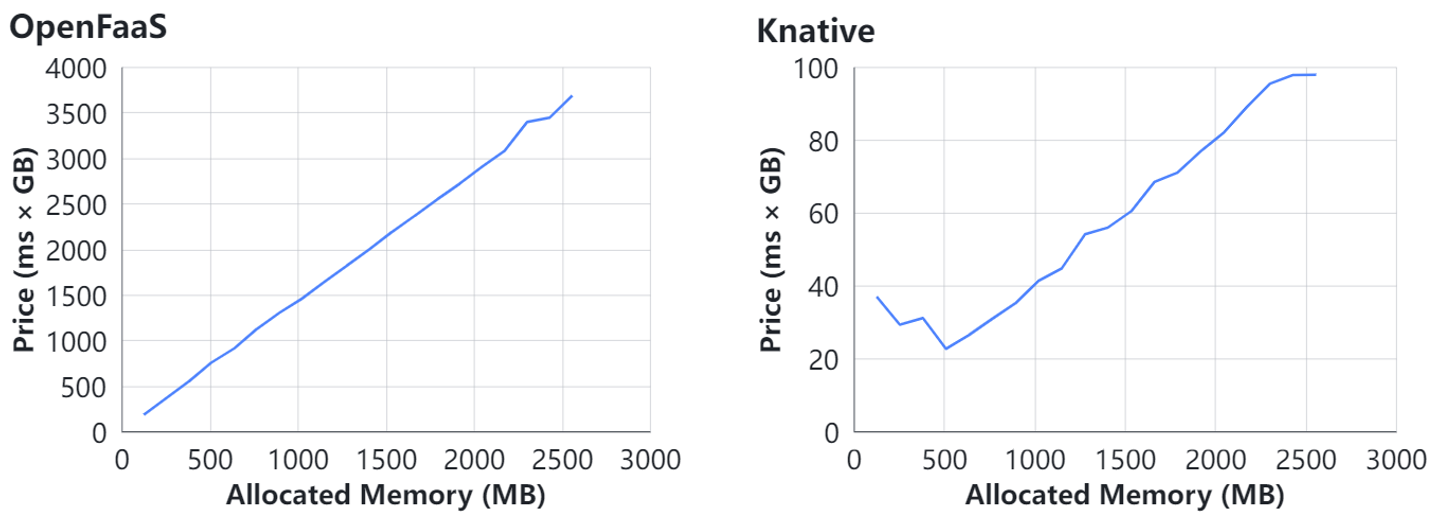 利用Numpy Matmul,逐步调整给函数所分配的资源数量,测量并观察资源数量对函数的执行时延(图8)与函数实例成本(图9)的影响。该用例反映的是相同资源开销下,函数在不同Serverless平台上的性能表现。图8和图9展示了在OpenFaaS和Knative上的部分结果。