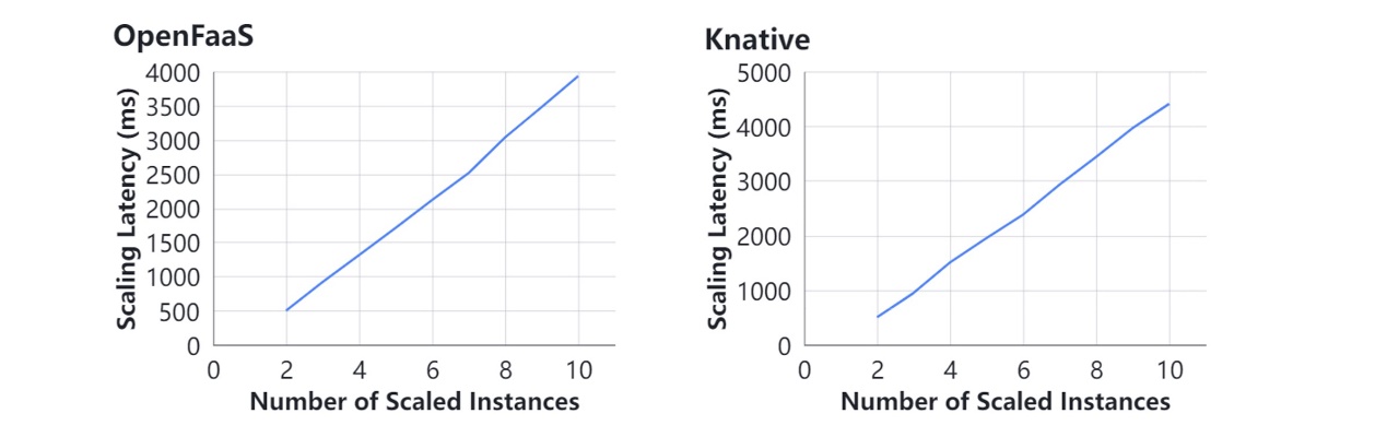 利用 Float Operation,测试并观察实例数量从1伸缩到某个较大值的过程中,多实例启动尾时延的大小。图7展示OpenFaaS和Knative从1个实例弹性扩容到10个实例的结果。