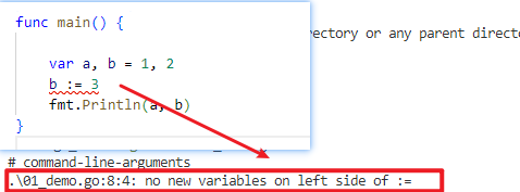该写法叫做推导声明写法,编译器会根据右值类型推断左值类型,而且需要注意,使用 := 需要左值变量必须在之前没有没定义过,否则就会报错,测试代码如下: