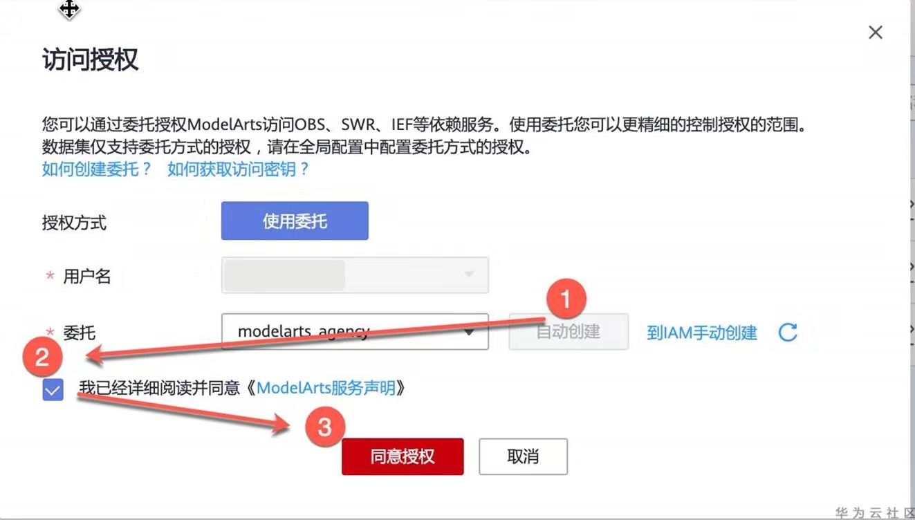 点此进入 ModelArts 控制台数据管理页面,上方会提示访问授权,点击【服务授权】按钮,按下图顺序操作: