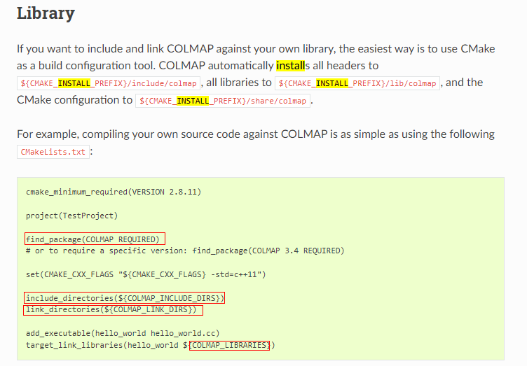 3. 在colmap的官方文档(https://colmap.github.io/install.html#linux)中,有详细介绍怎么调用colmap作为第三方库: