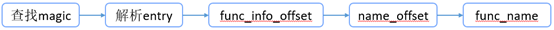 解析头信息可以获取magic, quantum, ptr_size, func_tab_count数据,当magic为’\xfb\xff\xff\xff’时,entry_size = 2 * ptr_size为entry结构体大小,func_tab_count 为entry结构体数量;解析entry结构获取到名称信息结构数据位置偏移(需要注意64位和32位go程序 func_info_offset位置相反),读取名称信息结构体数据,再从中获取到名称字符串位置偏移(name_offset),根据此偏移定位到函数名称字符串起始位置偏移,从该位置解析得到函数名称。