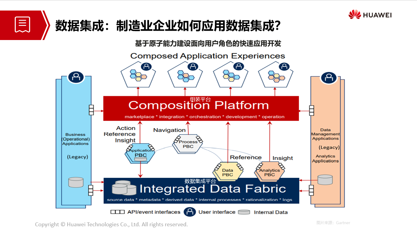 怎么打破这个困境呢?我们认为,要构建新型的企业软件开发模式。我们想到的是基于软件微服务形态的组装式应用,就是说我们有一个“软件仓”,在“软件仓”里面预置了很多软件的能力,我们称之为PBC(Packaged Business Capability,业务能力包)。它就像一个个的“原子”。结合企业用户的特点或者具体的业务需求,我们将这些“原子”进行分装。有点类似于大家广泛讨论的“业务中台”的概念,但它又不完全是业务中台,因为我们是通过数据的集成平台,把相应的软件的能力分装成PBC,然后通过一个“组装平台”把PBC组装成面向角色的应用软件。