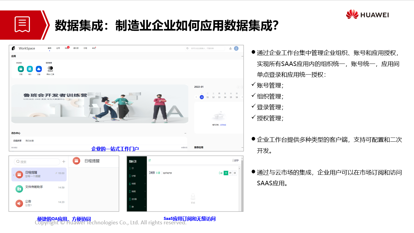 - 通过企业工作台集中管理企业组织、账号和应用授权,实现所有SaaS应用内的组织统一、账号统一、应用间单点登录和应用统一授权。