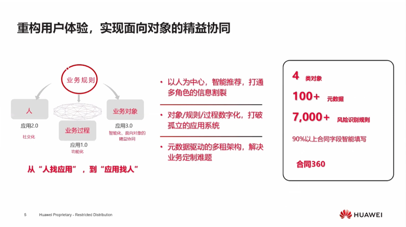 【摘要】 对于企业来说,产品数字化是主线,客户数字化是核心,运营数字化是体系,生态数字化是目标,这是我们华为对于数字化历程的理解。产品数字化主要涉及研、产、供、销、服等方面,是数字化转型的主线。客户数字化则是我们的核心,我们时刻关注客户体验,并注重提升。而在从产品数字化到客户数字化的过程中,怎么让我们产品更好地经过生命周期的运作、有效地向客户进行一个价值传递,这就涉及到运营的数字化了。当然更长远目标来...