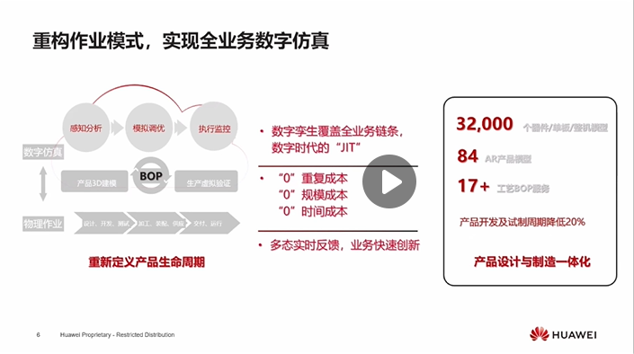对于企业来说,产品数字化是主线,客户数字化是核心,运营数字化是体系,生态数字化是目标,这是我们华为对于数字化历程的理解。产品数字化主要涉及研、产、供、销、服等方面,是数字化转型的主线。客户数字化则是我们的核心,我们时刻关注客户体验,并注重提升。而在从产品数字化到客户数字化的过程中,怎么让我们产品更好地经过生命周期的运作、有效地向客户进行一个价值传递,这就涉及到运营的数字化了。当然更长远目标来看,企业带动所在的整个行业链条的数字生态连接,是我们共同追求的目标。