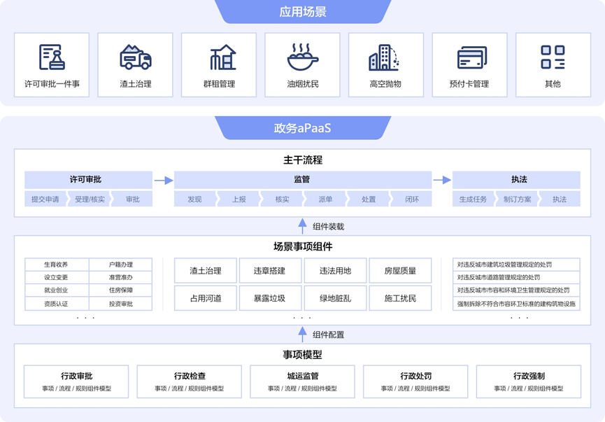 政务aPaaS包括许可审批、监管、执法等业务SaaS,以及场景事项组件及事项模型,支撑城市治理多场景应用的SaaS应用构建和扩展