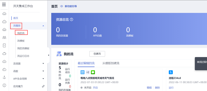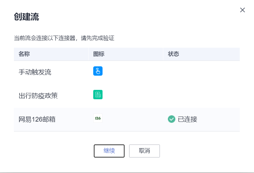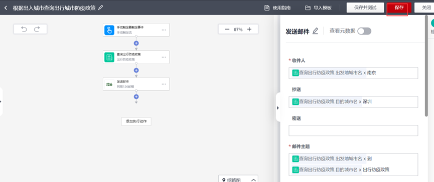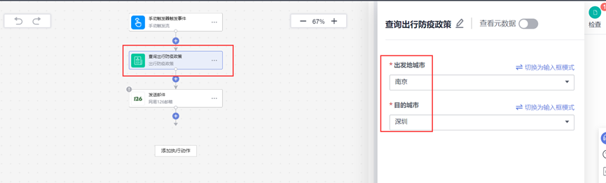 选择从模块创建流,选择根据出入城市查询城市防疫政策;
