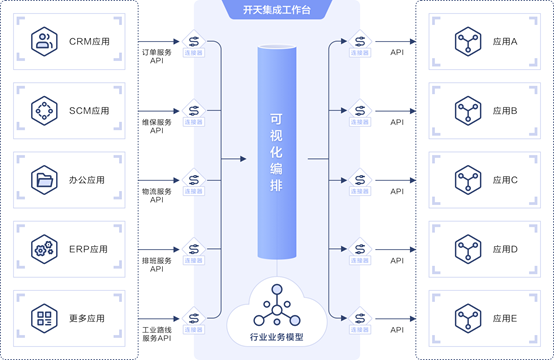 基于业务模型和API,封装成连接器,使得每个应用只需集成一次,实现X*Y*Z变成X+Y+Z。