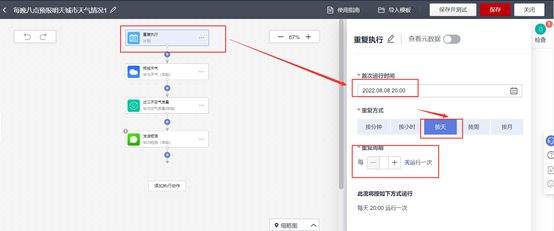 选择重复执行-首次运行时间-重复方式;