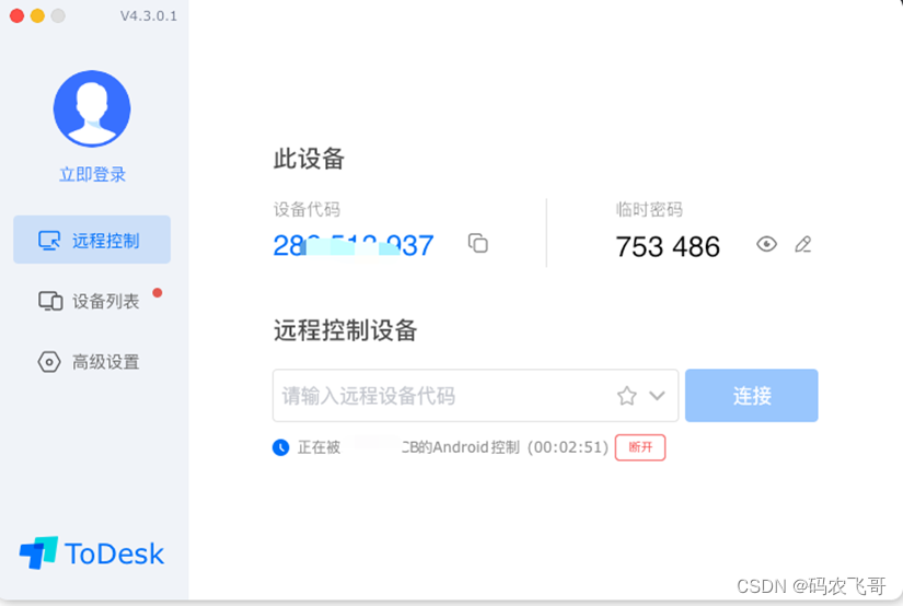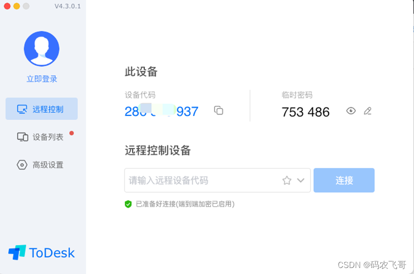 安装好ToDesk的客户端之后,打开此客户端会显示设备代码和临时密码。