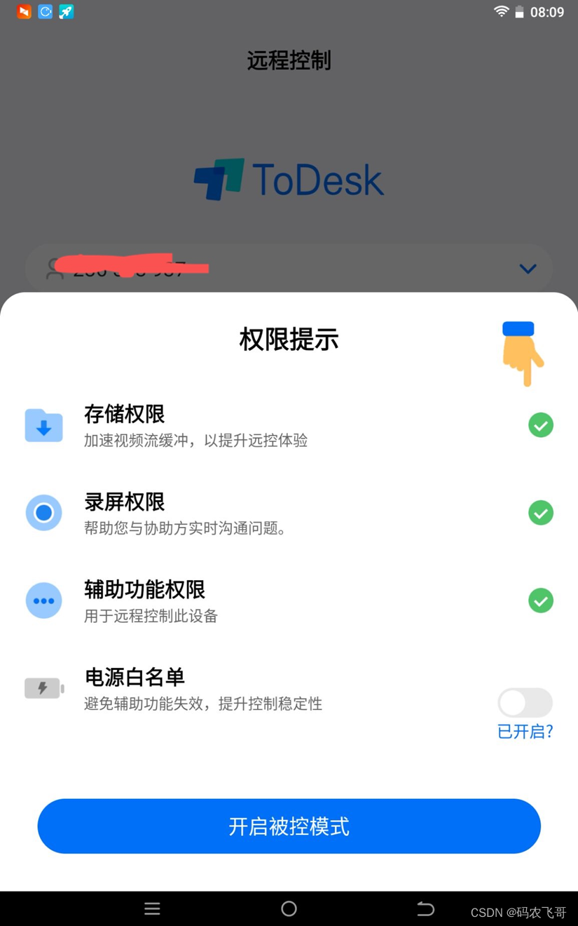 为了降低安全风险,需要在控制端和被控端都需要登录同一个账号。当用手机远控平板时,需要在平板上开启【允许远程本设备】选择【控制模式】,并且需要开启辅助功能权限,其他的权限可按需开启。