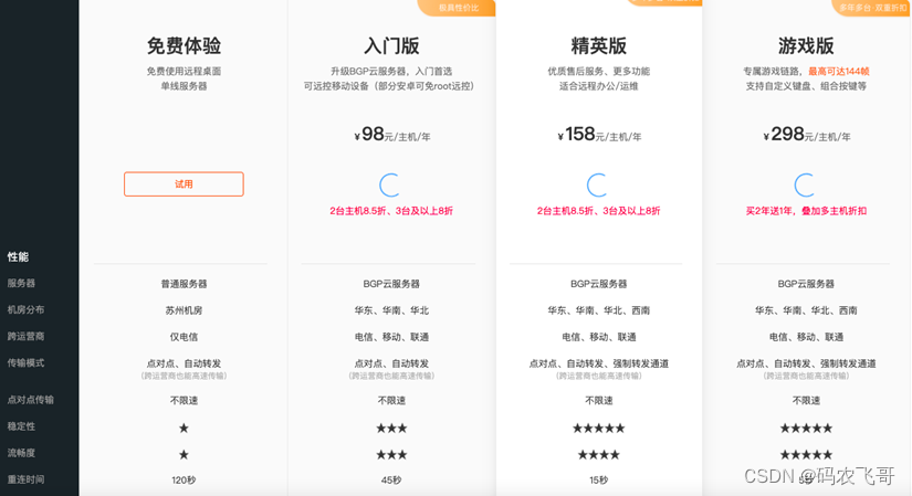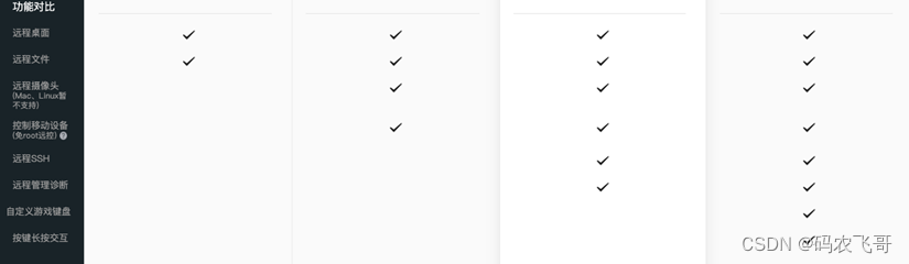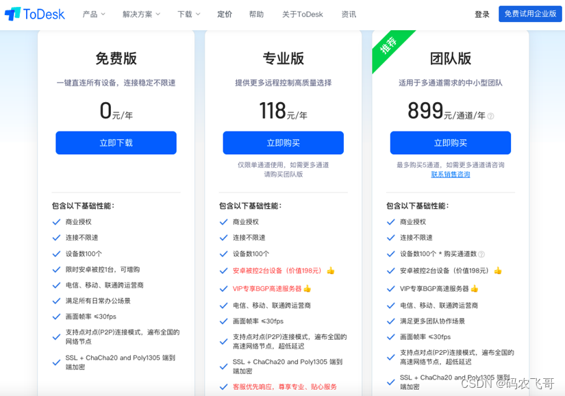 通过前面的测评我们可以得出如下结论:同样是个人免费版,向日葵的功能点要比ToDesk更加丰富一点,向日葵支持软件内屏幕录制以及截屏,ToDesk目前暂不支持。但是在画质和操作的流畅度上,ToDesk还是更强一点,在弱网的情况下,向日葵客户端经常会出现连不上服务器的情况,而ToDesk则可以快速连接,下面就简单对比下两者的定价以及功能介绍。