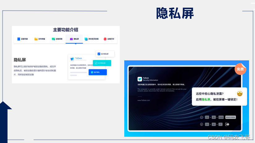 除了上面介绍的常用功能以外,ToDesk以及向日葵均支持远程打印、远程开机、隐私屏等。其中隐私屏就是让被控端进入锁屏状态,从而防止信息泄漏。两者的主要区别是ToDesk在免费版提供了隐私屏,而向日葵只在付费版才提供隐私屏。