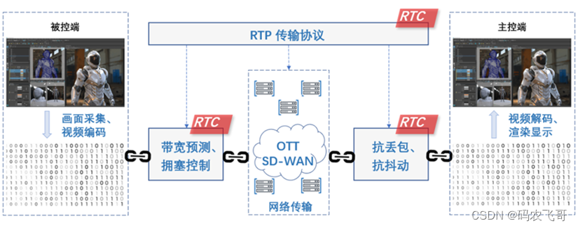 1. 被控端编码好的数据发出时:RTC会预测路线拥塞状况、控制发包速度,确保数据有序、顺畅地进入网络