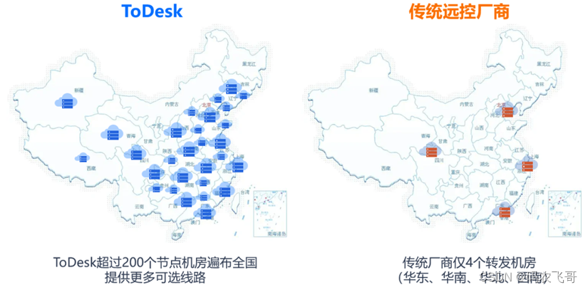 ToDesk SD-WAN 目前在全国部署的机房数量已经超过200个,覆盖密度远远高于传统远控厂商。从而实现了对机房节点的有效调度。