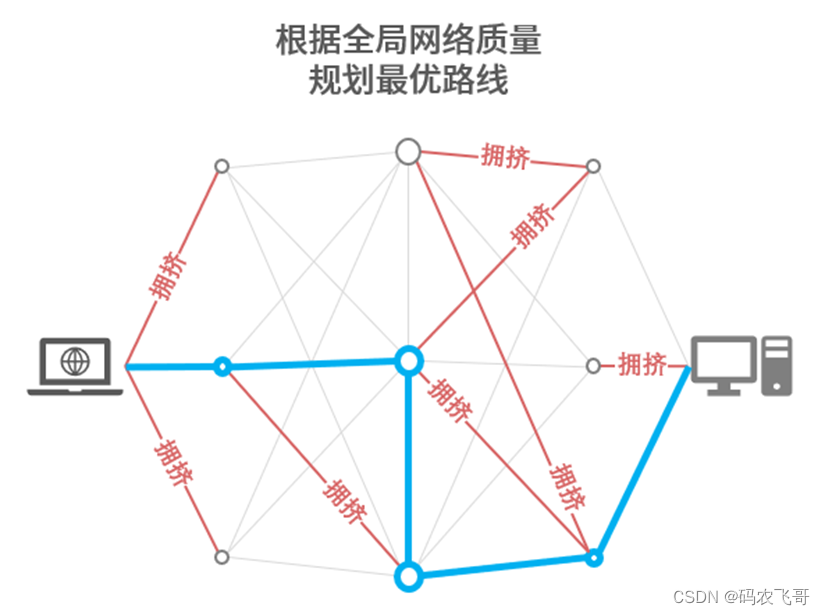 基于实时探测到的信息,ToDesk SD-WAN进行全局计算,选出最佳接入节点和最佳转发路线。