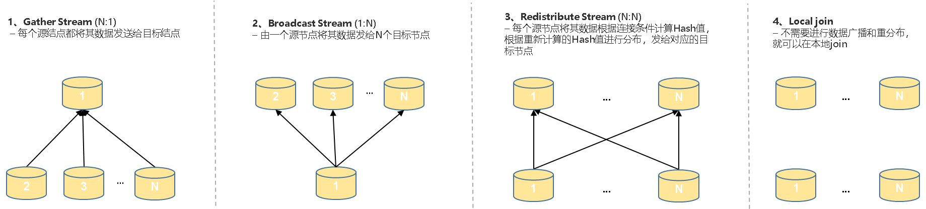 以上第一种其实是数据广播算子,第二种为数据重分布算子,而第三种join的数据存储在本地不需要进行分布式交换。其实对于ClickHouse来说,说是实现了Shuffle JOIN还比较勉强,其只实现了类Broadcast JOIN类型,ClickHouse当前的分布式join查询框架更多的还是实现了两阶段查询任务(这里不详细讲解,后续几个章节分别进行展开讲解,大家可以细细体会),与ClickHouse相比通常业界MPP数据库分布式join查询框架模型的数据在节点间交换Streaming算子通常为以下几种: