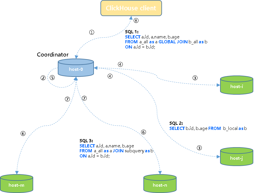 ⑥ 子查询执行完成后将结果集返回到协调节点,如:host-j;