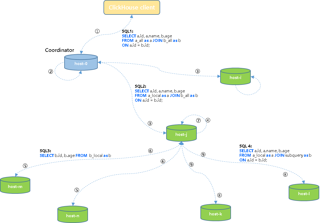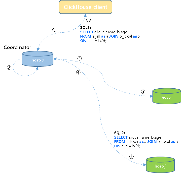 ① 客户端将SQL1发送给集群中一个节点host-0(initiator/coordinator);