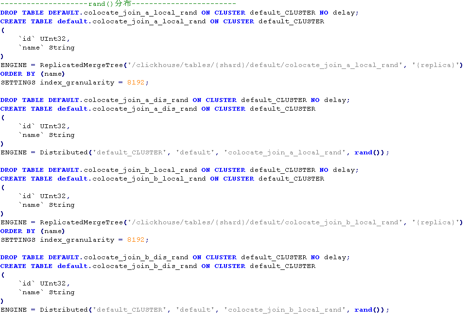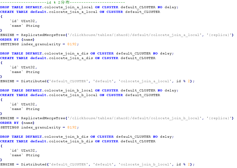 2)用例:分别创建join字段按id % 2(2为shard个数,可根据实际集群环境进行调整)取余数据分布方式(相同id数据分布到同一个节点),以及ROUND ROBIN (数据随机rand分布)数据分布方式分布式表和本地表,分布式表指定分布方式,本地表为Replicated表,具体用例如下: