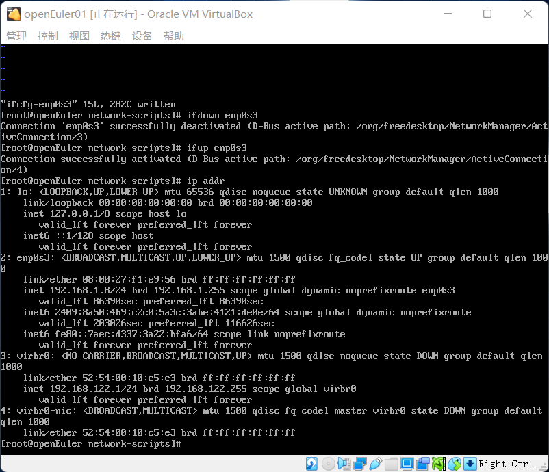 使用ifdown enp0s3 和 ifup enp0s3 命令保存修改重启网卡