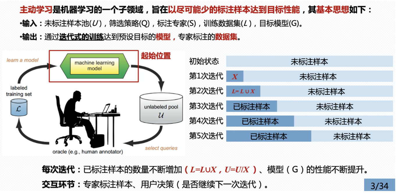 主动学习 V.S. 半监督学习:在机器学习领域中,利用未标注样本和标注样本进行机器学习的算法可归纳为三类:半监督学习、直推式学习和主动学习 。