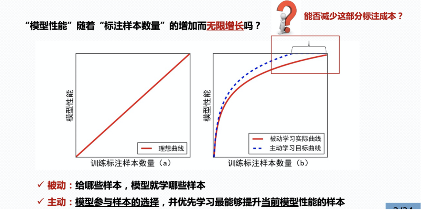 如下图(a)所示,实线表示理想情况下模型性能随着标注样本数量的增多而无限地提升。