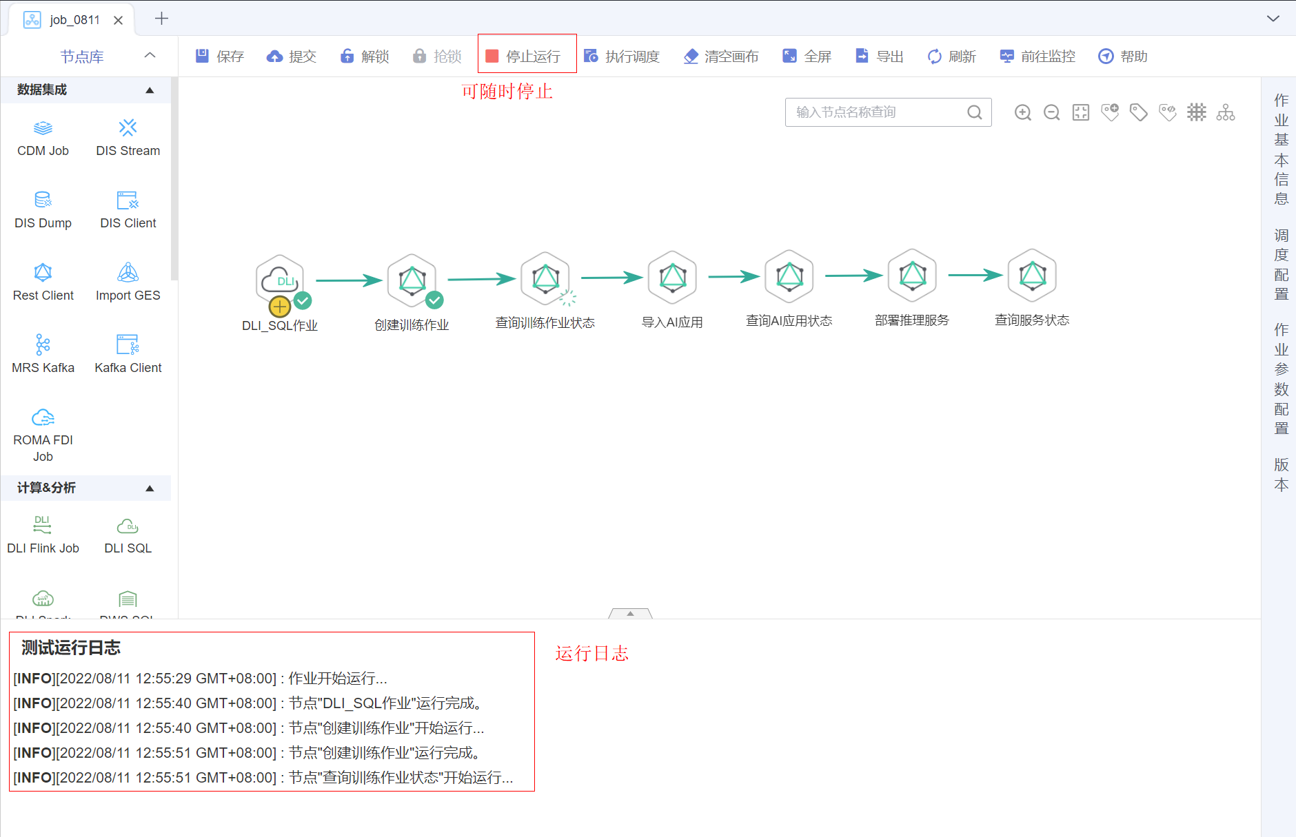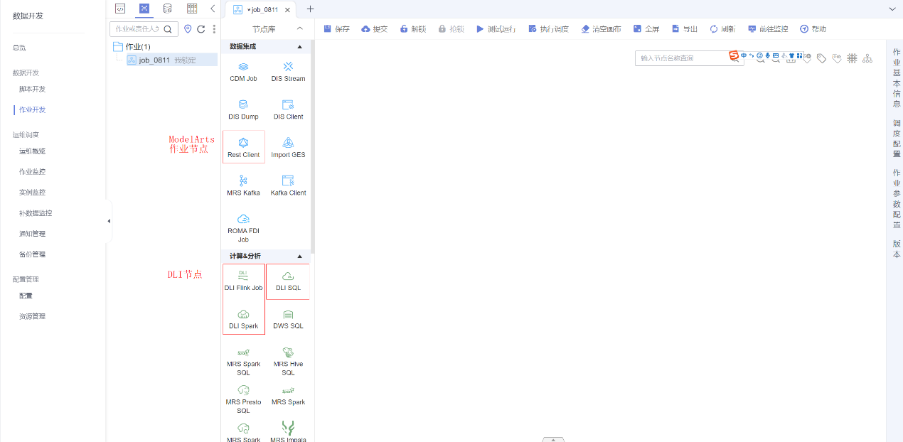 进入作业编辑作业,ModelArts作业选用Rest Client节点,DLI相关作业选用DLI相关节点,其余大数据侧节点同理。