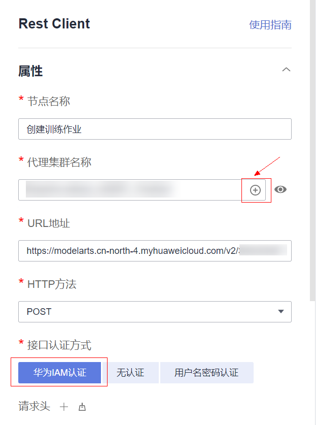 执行ModelArts作业或者查询ModelArts作业,通过Rest Client节点调用rest请求的方式实现。点击节点进行编辑,代理集群名称点加号选择,接口认证方式选择“华为IAM认证”: