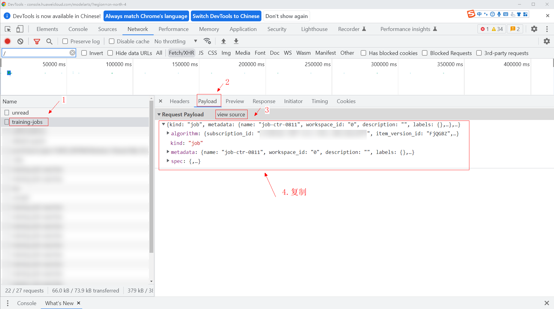 在ModelArts创建训练作业时,点击F12,得到如下界面,以创建训练作业为例,点击training-jobs,点击Headers,得到region和project_id信息,HTTP方法对应图中Request Method显示的POST:
