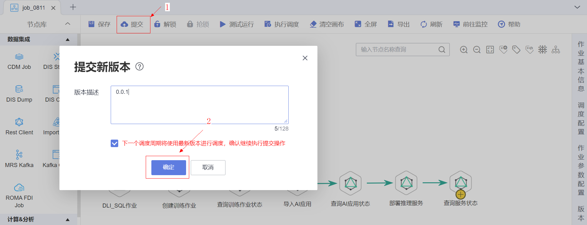 设置调度配置后,在指定时间,会自动以最新提交版本的状态运行作业。