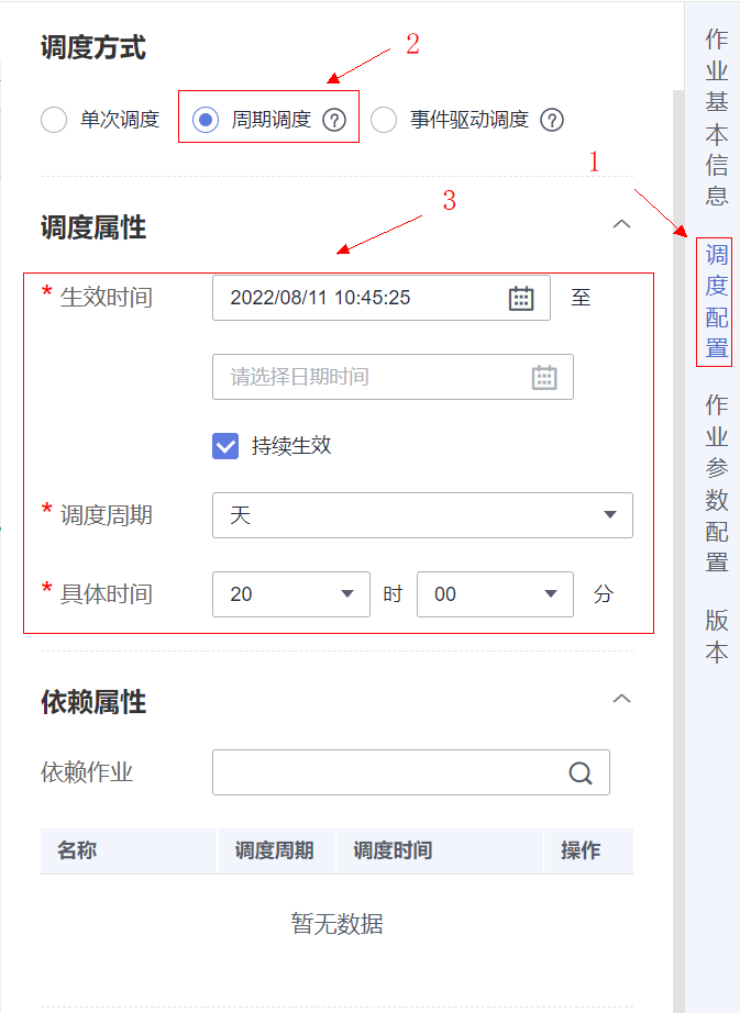 如图选择调度配置,选择周期性调度,则从即日起每天20点执行一次作业: