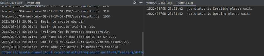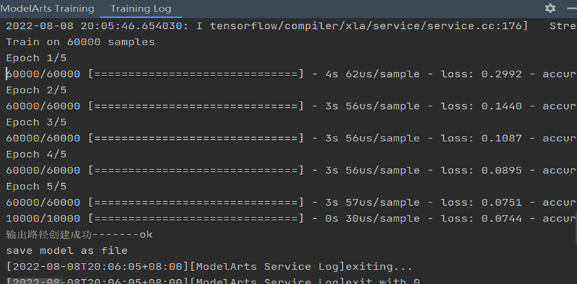 提交完成后即可以看到训练作业日志实时打印,并输出训练模型