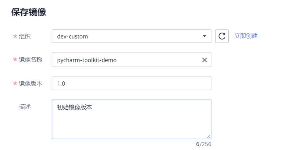 对要保存的镜像填入组织名称和镜像名称以及版本号